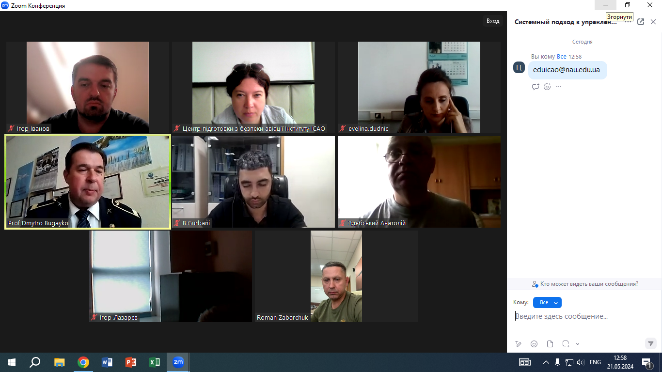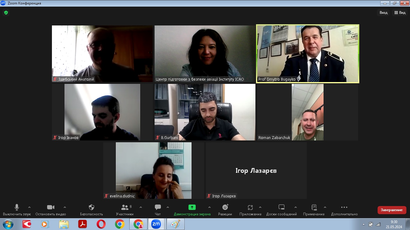 20 – 21 травня 2024 року Інститутом ІСАО НАУ проведено курс «Системний підхід до управління безпекою авіації» для керівного складу суб’єктів авіаційної діяльності. Група слухачів включала в себе заступника генерального директора АТ «АНТОНОВ» Романа Забарчука, директорів авіакомпаній АТ «МОТОР СІЧ» Ігоря Лазарєва та ТОВ «ЕЙР ТАУРУС» Ігоря Іванова, керівника з безпеки польотів ТОВ «ВУЛКАН ЕЙР АКАДЕМІ» Анатолія Здебського, менеджера з якості та безпеки польотів, національного інспектора «AEROPORT HANDLING» SRL (Кишинів, Молдова) Евеліну Дудник, інспектора з технічного обслуговуванню авіакомпанії «SILK WAY AIRLINES» (Баку, Азербайджан) Бурхана Гурбані. Курси провів інструктор ІСАО, заступник директора Навчально-наукового Інституту міжнародного співробітництва та освіти, доктор економічних наук, член кореспондент академії економічних наук України, професор кафедри логістики Національного авіаційного університету Дмитро Бугайко.